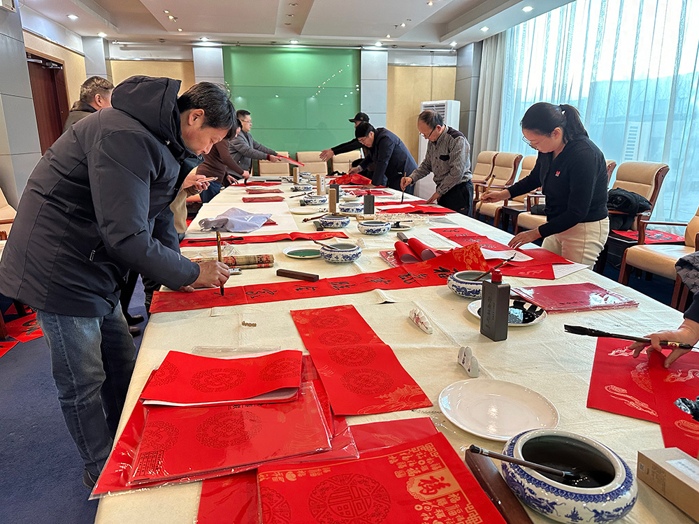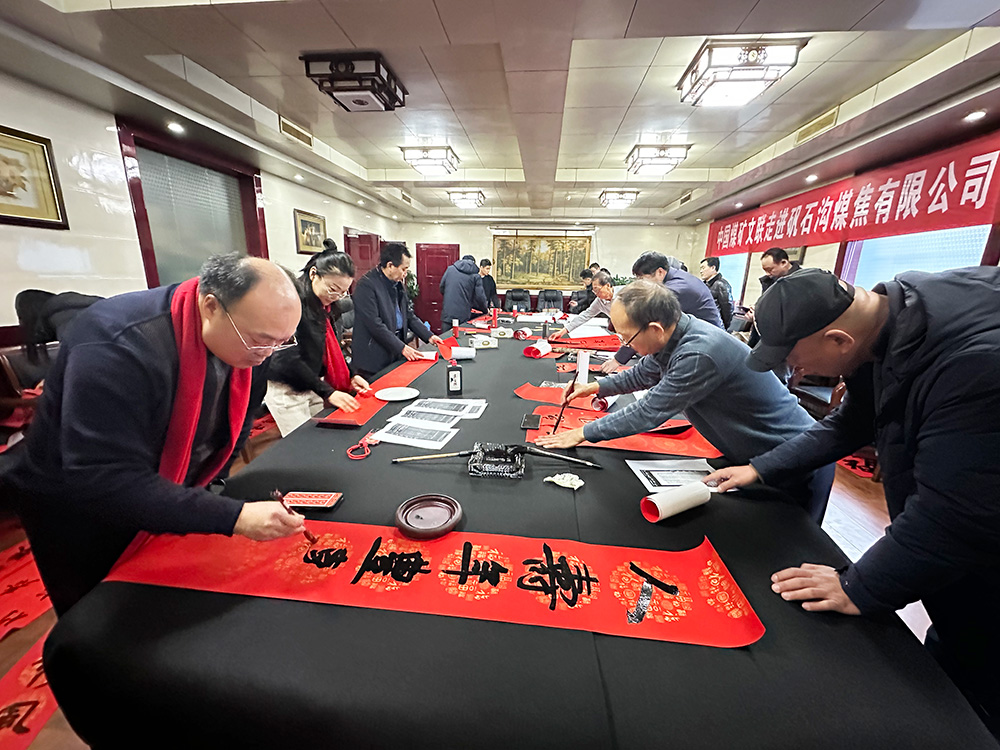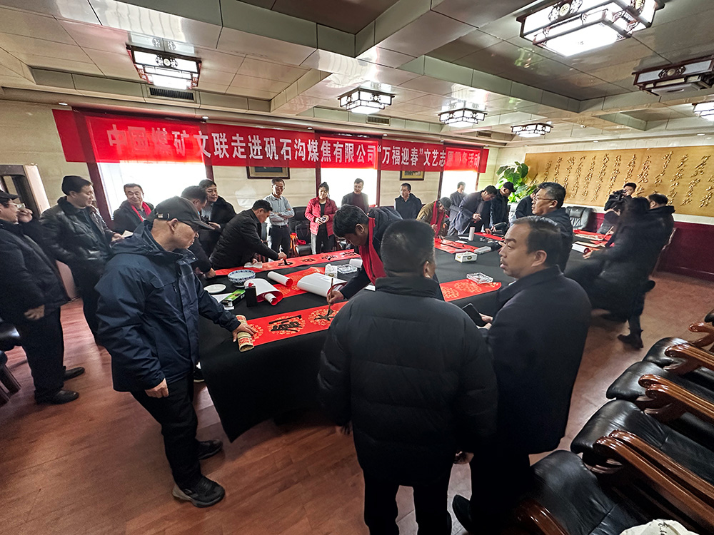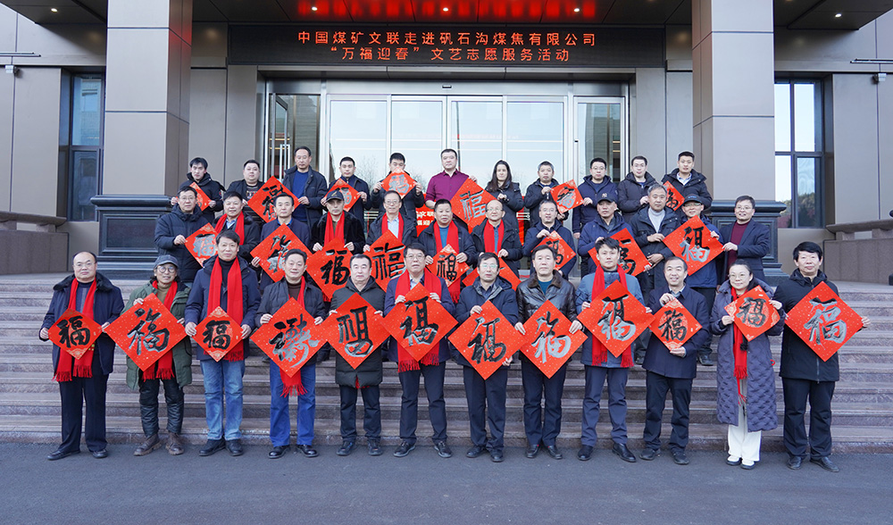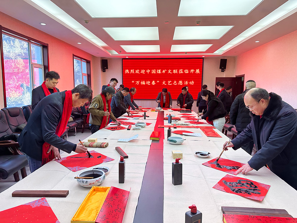 2025年1月15日至17日,中国煤矿文联走进山西古交市煤炭企业开展“万福迎春”文艺志愿服务活动。活动由中国煤矿文联和中国煤矿文化宣传基金会主办,山西省煤炭文化体育联合会承办。中国煤矿文联主席、中国文艺志愿者协会理事盛军带队,中国煤矿文联秘书长、中国文艺志愿者协会理事辛凡忠,山西省煤炭文化体育联合会主席智勇,中国煤矿文联书协副主席杨玉剑,中国煤矿文联志愿者分会副主席马铭,中国煤矿文联书协理事、古交市书协主席周先宝,中国煤矿文联美协副秘书长李馨,中国煤矿文联书协理事庞夫玉、李晓鹏、马凤山等一行10人先后来到古交市千峰精煤有限公司和古交市矾石沟煤焦有限公司等地,为职工群众现场写春联、送“福”字,送上了美好的新春祝福。活动期间,共创作赠送书画作品200余幅,春联近1000套,“福”字1200多个。