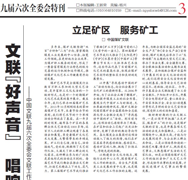 煤矿艺术节是全国煤炭行业数百万职工参加的大型文艺活动,是丰富职工文化生活的一个极好形式,也是对一个时期煤矿文化艺术成果的集中展示。截至今年,我们已举办四届煤矿艺术节。2013年10月刚刚结束的第四届煤矿艺术节,本着节俭办节的原则,我们将艺术节的十个单项活动全部放在了基层。在一年多的时间里,遍布各个矿区的各类群众性文艺活动达1000多场,近百万人次的职工群众观看了各类演出和展览,享受着煤矿文化艺术大发展、大繁荣带来的丰硕成果。矿工们自己演,演自己,活动接地气,受欢迎,既锻炼了文艺创作队伍,又满足了职工群众的文化需求,这种群众参与的广泛性是其他形式的活动达不到的。每届艺术节我们都会在推出文艺新作,打造艺术精品上下功夫、花气力。第三届煤矿艺术节我们推出了歌曲《矿工万岁》《最可爱的人》《大雪中的一盆火》。第四届煤矿艺术节我们又推出了《太阳花开》《守护》《水墨丹青》《中国矿工》等舞台节目及一大批书画艺术佳作,这些作品代表了目前煤矿文化艺术的最高水准,体现出煤矿艺术创作的整体实力和良好的发展势头。
