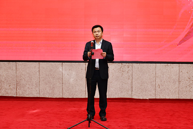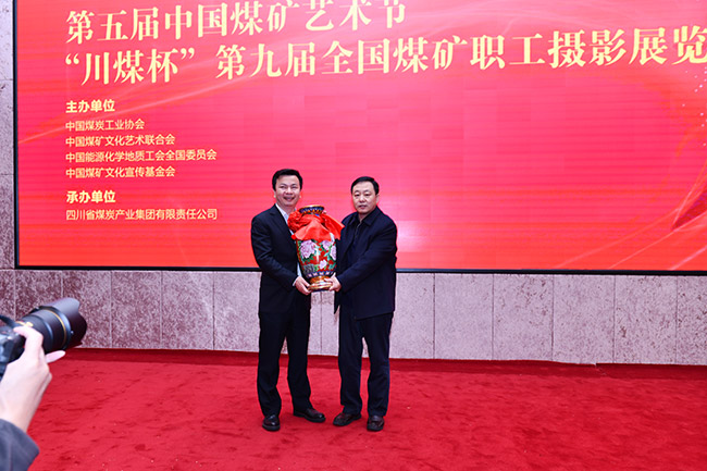 张强向川煤集团赠送了第五届中国煤矿艺术节特别贡献奖杯并代表第五届中国煤矿艺术节组委会讲话。他指出,多年来,一批批煤矿摄影人活跃在全国各矿区,穿梭在矿山和矿工之间,用镜头记录着煤炭人生产生活发展变化的点点滴滴,煤炭行业的摄影家和摄影作品在全国全社会的影响力不断扩大。他强调,作为新时代的煤矿文艺工作者,要紧密地团结在一起,守住为煤矿工人谋幸福的初心,担起推动煤炭工业高质量发展的光荣使命,积极投身火热的煤矿生产生活,坚定文化自信、把握时代脉搏、聆听时代声音,坚持与时代同步伐、以人民为中心、以精品奉献人民、用明德引领风尚,切实肩负起新时代“培根铸魂”的责任和使命,用优秀的文艺作品记录新时代煤炭工业的辉煌发展成果,以实际行动庆祝伟大的新中国成立70周年。