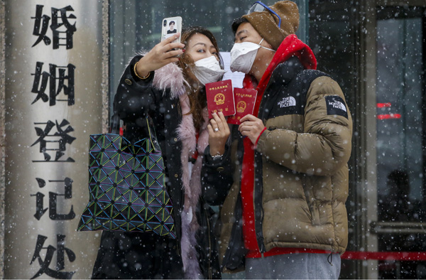 2020年2月14日是情人节,情侣们冒雪来到朝阳区民政局登记领取结婚证。今年受疫情影响只接受预约登记,办理时随办随走没有出现往年排队的现象。金质收藏 曹博远摄