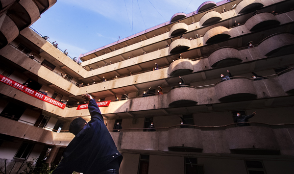 《复工之前》 疫情防控伊始,淮河能源煤业张集煤矿是安徽省首批复工的矿井。在保障媒电供应的过程中,这个矿积极有序的做到了安全生产和疫情防控两不误。图为2020年3月4日,最后一批复工职工在矿隔离观察点内参加集中体能训练。铜质收藏 胡清风摄