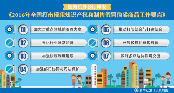 国务院办公厅印发《2016年全国打击侵犯知识产权和制售假冒伪劣商品工作要点》