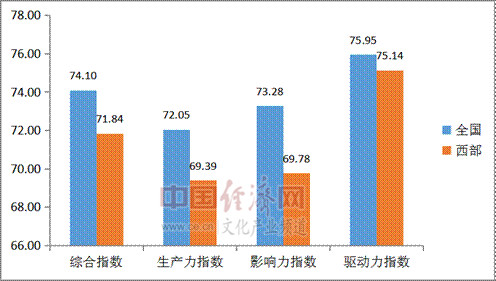 中国西部省市文化产业发展指数(2017)显示,总体来看,西部地区各省市文化产业发展综合指数和全国平均水平比较存在一定差距。从分指标来看,生产力指数和影响力指数西部地区和全国差距尤为明显,而反映文化产业外部发展环境的驱动力指数,西部地区和全国基本持平。