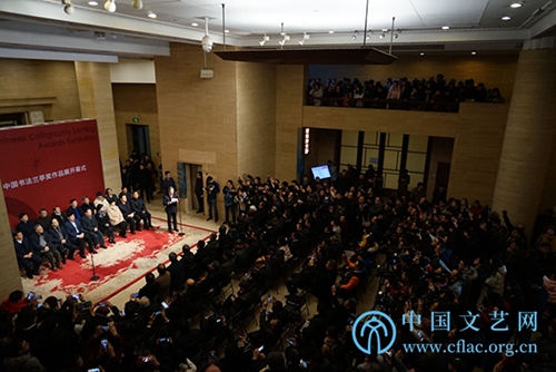 1月11日,由中国文联、中国书协主办的第六届中国书法兰亭奖作品展在中国美术馆开幕。图为开幕式现场。