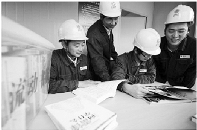 安徽送变电工程公司的职工在工作之余聚集在流动书箱旁读书加油充电