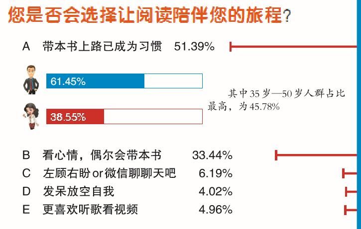 春节前后,中国新闻出版广电报微信公众号推出春节与阅读问卷调查,就是否选择让阅读陪伴旅程、是否会选择图书作为礼物等问题进行调查。调查显示,51.39%的人选择路上带本书;36.22%的人认为旅程中的阅读与平时没太大区别,21.98%的人选择在路途中进行轻松的浅阅读,17.65%的人选择在路上读开本小、轻便的图书,13.62%的人旅途中看小说等文学图书,4.34%的人读悬疑推理类图书,6.19%的人选择诗词鉴赏类篇幅短小的图书。数据同时显示,25.70%的人经常把图书作为春节礼物送亲朋,23.53%的人没有在春节期间送过图书但表示可以尝试。分析调查数据我们认为,经过10余年的阅读推广,全民阅读已经较大范围地融入百姓生活,与此同时,阅读呈现出个性化、多样化特点,阅读推广、图书推荐都存在较大空间。