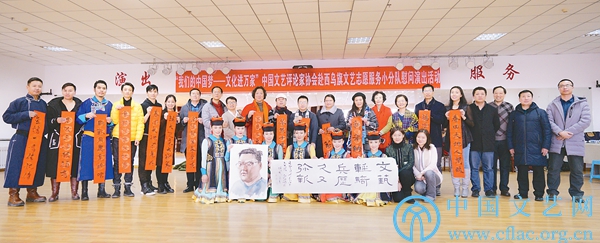 按照中宣部、中国文联统一部署,为全面贯彻落实党的十九大精神,深入学习贯彻习近平总书记给乌兰牧骑队员回信的重要指示精神,落实《中共中央宣传部等关于2018年元旦春节期间广泛开展“我们的中国梦”——文化进万家活动的通知》要求,2018年1月下旬、2月初,中国文艺评论家协会志愿服务小分队分赴新疆昌吉、阜康,内蒙古锡林郭勒盟和宁夏吴忠、中宁开展“我们的中国梦——文化进万家”慰问演出活动,为地方群众送去了丰富多彩的精神文化食粮。