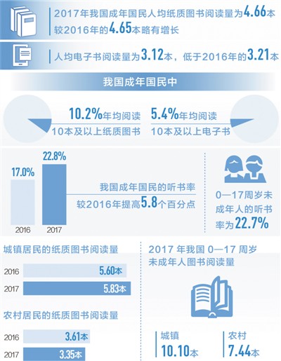 中国新闻出版研究院18日在京发布第十五次全国国民阅读调查报告,数据显示2017年我国成年国民人均纸质图书阅读量为4.66本,“听书”快速增长,城乡居民阅读状况差距较大。