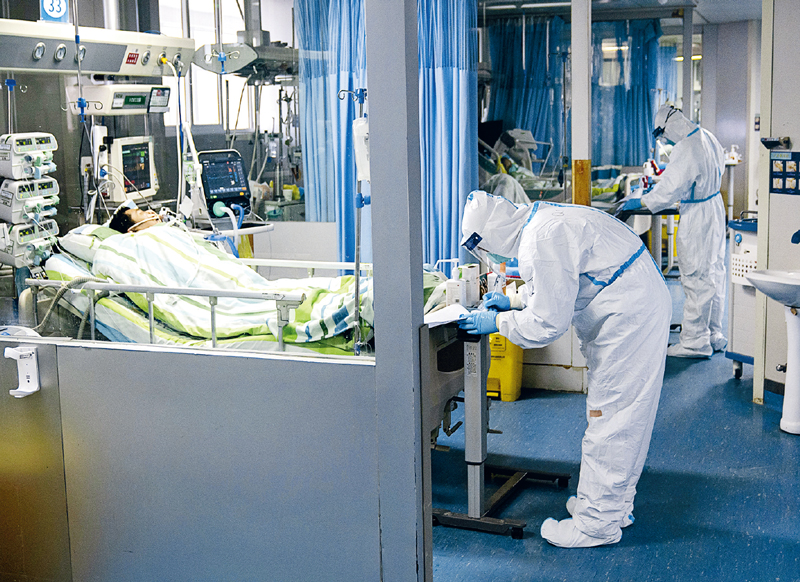 在抗击新冠肺炎疫情的战役中,广大医务人员义无反顾、逆行出征,白衣执甲、不负重托,诠释了医者仁心和大爱无疆。图为2020年1月24日,在武汉大学中南医院重症隔离病房,医务人员为病人治疗。 新华社记者 熊琦 摄