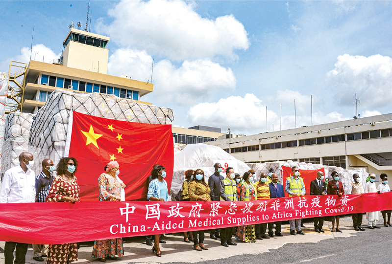 2020年4月6日,中国援助18个非洲国家的抗疫物资运抵加纳。除加纳外,这批物资还将在这里中转运往其他17个国家,以帮助当地抗击新冠肺炎疫情。图为中国驻加纳大使馆相关人员与接受援助国家的代表合影。 新华社记者 许正 摄