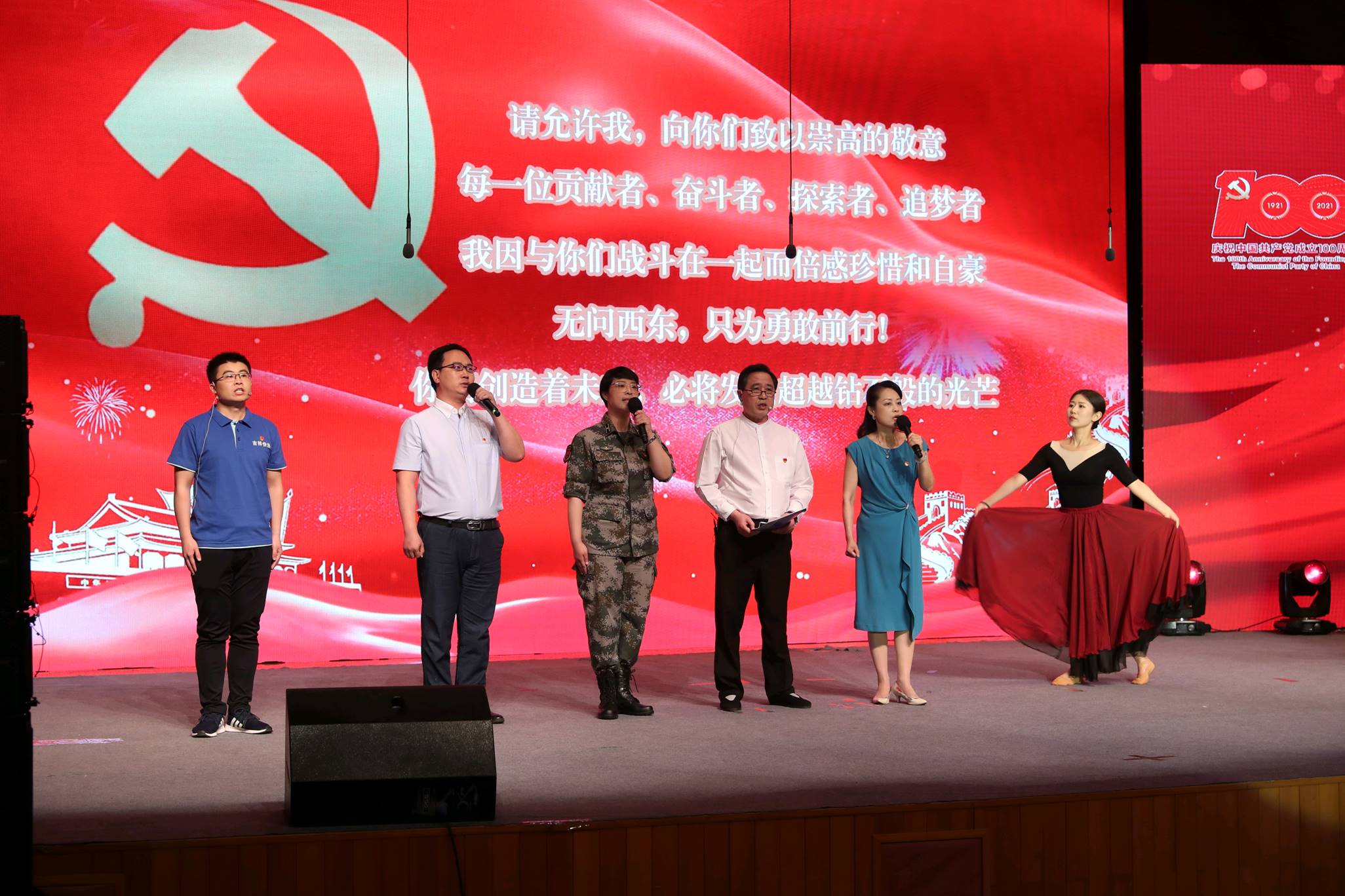 “青沉沉的大海,波涛汹涌着,潮向东方。光芒万丈地,将要出现了哟——新生的太阳!”人民文学杂志社朗诵的高亢赞歌《太阳礼赞》拉开了朗诵会的序幕。中国作协机关党委(人事部)朗诵的《兴业路:睁开中国的眼睛——写在党的一大会址》、中华文学基金会朗诵的《致敬,共和国最美的身影》表现了最早一批革命播“火”者的初心与使命,以及新中国成立以来一批批最美奋斗者的伟岸身姿。中国作协创作研究部的合诵《复活的土地》、鲁迅文学院的情景朗诵《黄河新颂》、中国作协网络文学中心的合诵《有的人》、小说选刊杂志社的合诵《谁是最可爱的人》(节选)、文艺报社的合诵《回延安》、中国作家杂志社的合诵《哥德巴赫猜想》(节选)、民族文学杂志社的合诵《祖国啊,我亲爱的祖国》,彰显了一代代中华儿女为了实现国家富强、民族复兴而矢志不移的精神风貌。中国现代文学馆朗诵的《北京时间》、中国作协办公厅朗诵的《祖国奏鸣曲》、中国作协社会联络部朗诵的《地图上的故乡》、中国作协机关服务中心朗诵的《飞驰吧,青春中国》、中国作协对外联络部朗诵的《坐上高铁,去看青春的中国》、作家出版社朗诵的《大道阳关》、诗刊社朗诵的《为山河立传》聚焦新时代新现实新气象,表达出亿万人民在以习近平同志为核心的党中央引领下踏上新征程,为实现中华民族伟大复兴中国梦不懈奋斗的坚定信念。朗诵会上播放了中国作协临潭扶贫纪录片片段,中国作协创作联络部和中国作家出版集团分别朗诵了脱贫攻坚题材诗作《2020封面中国:十八洞村的笑容》《在飞机上俯瞰花鹿坪》。中国作协名誉副主席王蒙通过视频与在朗诵会现场的青年作家共同朗诵了《青春万岁》片段。铁凝、钱小芊和中国作协党组书记处同志共同朗诵了《可爱的中国》。朗诵会在大合唱《歌唱祖国》中结束,表达了中国作协干部职工对党和祖国的热爱赞美之情和为繁荣发展社会主义文学事业继续努力奋斗的豪情壮志。