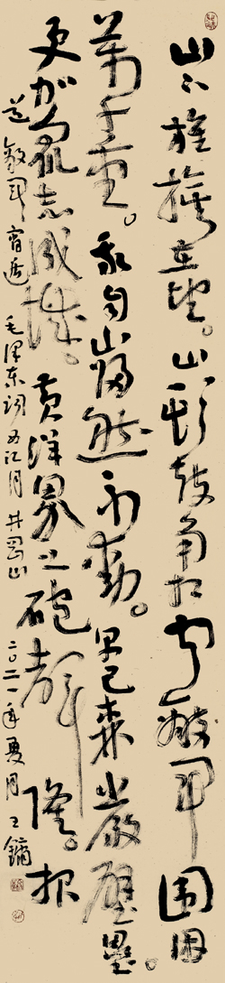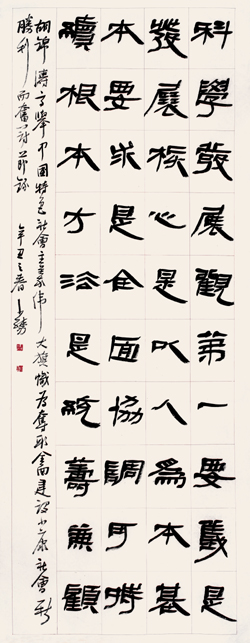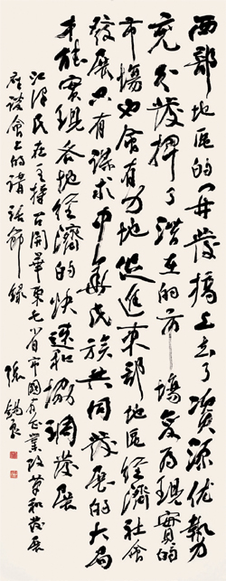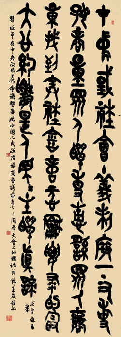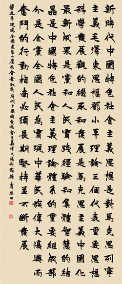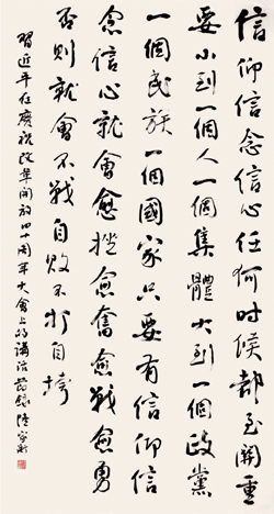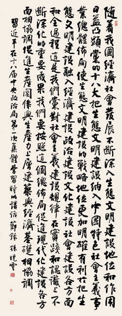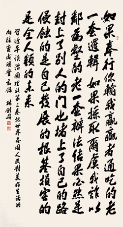 习近平总书记强调:“一切伟大成就都是接续奋斗的结果,一切伟大事业都需要在继往开来中推进。”衷心希望广大书法工作者以这次展览为契机,进一步深入学习贯彻习近平新时代中国特色社会主义思想,特别是习近平总书记关于文艺工作的重要论述,胸怀两个大局,心系国之大者,增强文化自信,自觉承担起举旗帜、聚民心、育新人、兴文化、展形象的使命任务,真正做到胸中有大义、心里有人民、肩头有责任、笔下有乾坤。衷心希望广大书法工作者认真参与“四史”特别是党史学习教育,固本培元、砥砺品格,真正做到学史明理、学史增信、学史崇德、学史力行,用心用情用功传承红色文化基因、书写伟大时代华章,为建设社会主义文化强国、全面建设社会主义现代化国家贡献力量!