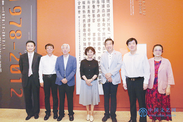 领导嘉宾合影:中国文联主席、中国作协主席铁凝(中),中国文联党组书记、副主席李屹(右二),中国文联党组成员、书记处书记张雁彬(左二),中国书协名誉主席张海(左三),中国书协名誉主席苏士澍(右三),中国书协主席孙晓云(右一),中国书协分党组书记、驻会副主席李昕