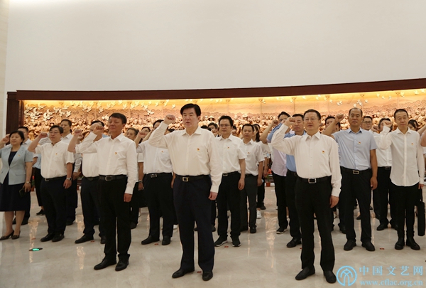 7月4日,中国文联组织参观“‘不忘初心、牢记使命’——中国共产党历史展览”。图为中国文联党组书记、副主席李屹,中国文联党组成员、副主席胡孝汉,中国文联党组成员、书记处书记张雁彬带领党员进行宣誓。中国文艺网 王丽摄