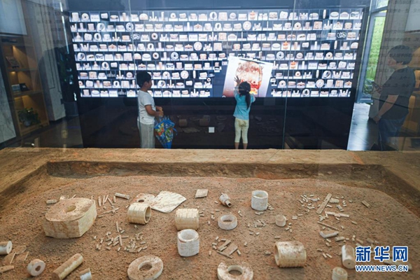 2020年6月6日,小游客在浙江省杭州市余杭区瓶窑老街的“良渚玉雕馆”内通过电子屏学习玉雕知识。新华社记者 徐昱 摄