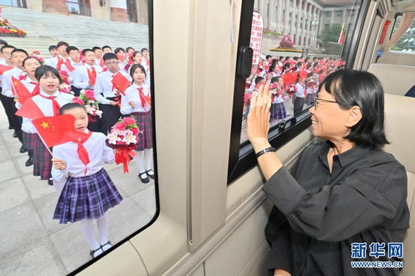 6月29日,庆祝中国共产党成立100周年“七一勋章”颁授仪式在北京人民大会堂金色大厅隆重举行。这是“七一勋章”获得者张桂梅向青少年致意。新华社记者 岳月伟 摄