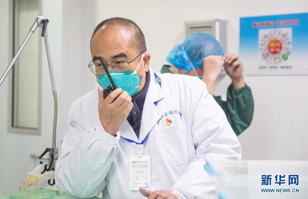 张定宇在武汉金银潭医院综合病区楼联系、协调工作(2020年1月27日摄)。新华社发(柯皓 摄)