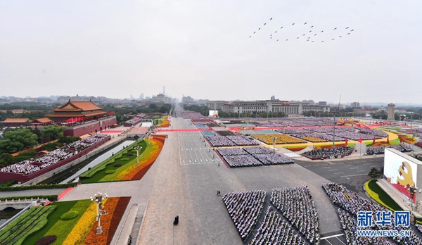 7月1日上午,庆祝中国共产党成立100周年大会在北京天安门广场隆重举行。这是大会开始前的飞行庆祝表演。新华社记者 李贺 摄