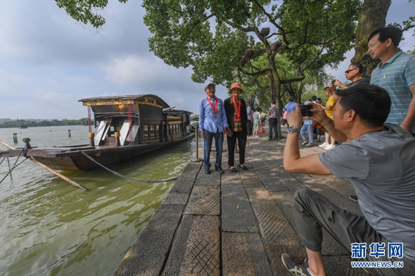 7月1日,两名老党员在浙江嘉兴南湖湖心岛停泊的南湖红船旁拍照留影。新华社记者 徐昱 摄