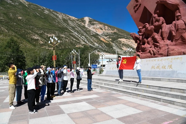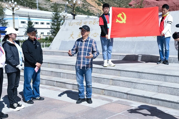 在纪念馆旁边的感恩广场,柳斌副秘书长带领采风团全体党员重温入党誓词,更加坚定新时代文艺工作者不忘初心、牢记使命的责任担当,冯双白主席结合自身经历,从唐山、汶川一直谈到玉树,从灾难讲到新生,带领大家重温了“大爱同心、坚忍不拔、挑战极限、感恩奋进”的玉树抗震救灾精神,进一步激发了大家为人民起舞的创作热情。