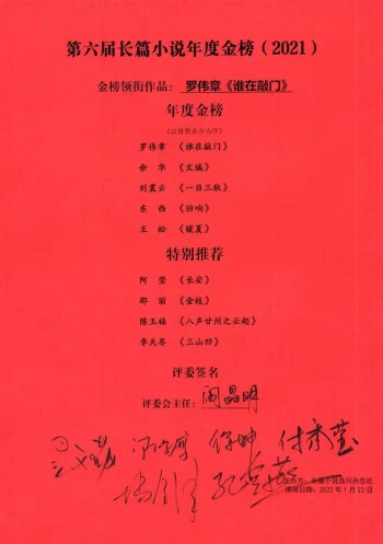 1月22日,“第六届长篇小说年度金榜(2021)”评选活动在京召开终评会议。15部初评阶段入围的2021年度优秀长篇小说,经过前期的读者网络投票和专家评委团现场终评投票后,决出5部“金榜作品”。其中,罗伟章《谁在敲门》成为金榜领衔作品,余华《文城》、刘震云《一日三秋》、东西《回响》、王松《暖夏》入选年度金榜,阿莹《长安》、邵丽《金枝》、陈玉福《八声甘州之云起》、李天岑《三山凹》则获得年度推荐。根据作者陈彦的主动要求,入围初评阶段的《喜剧》退出本届终选。