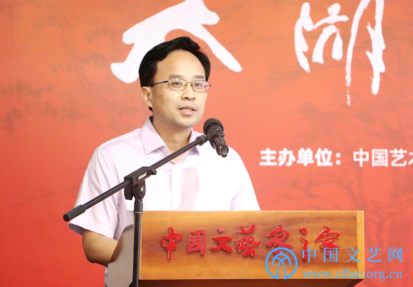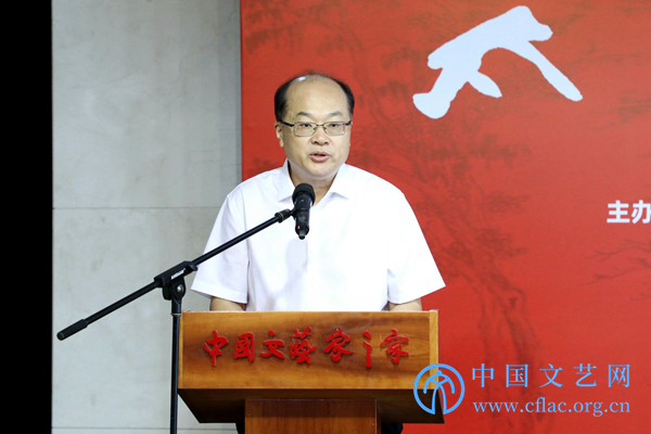 8月30日,“太湖风——无锡市书协成立四十周年作品展”在北京中国文艺家之家展览馆开幕。图为无锡市第十六届人大常委会党组副书记、副主任吴峰枫致辞。 中国文艺网 高森 摄