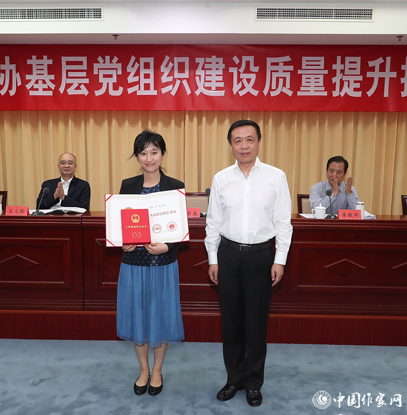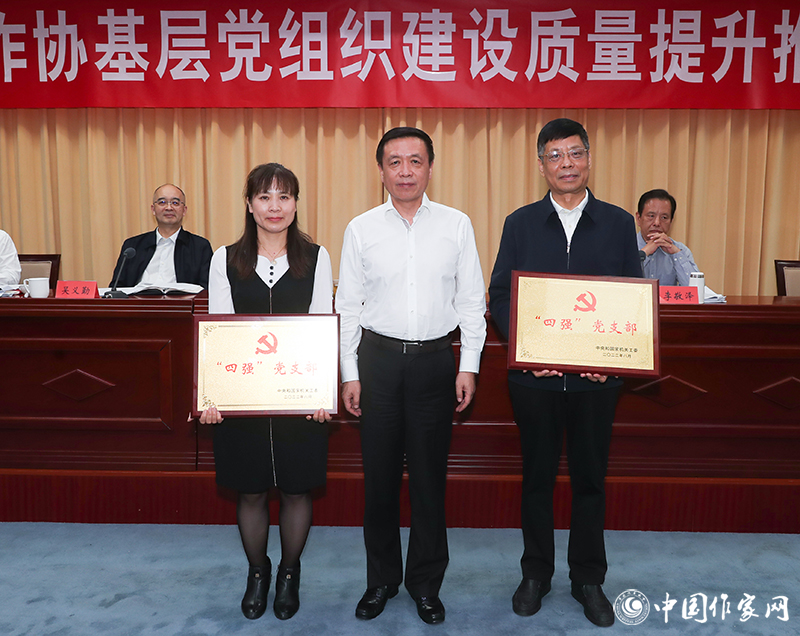 会议为获得中央和国家机关“四强”党支部称号的中国作协办公厅党支部、作家出版社有限公司第二党支部颁授奖牌,为获得全国“人民满意的公务员”的外联部王婉同志颁授证书、奖章。中国作协办公厅党支部书记李一鸣、作家出版社有限公司第二党支部书记王丽勇、鲁迅文学院党支部书记徐可、民族文学杂志社党支部书记石一宁等4位同志作了交流发言。