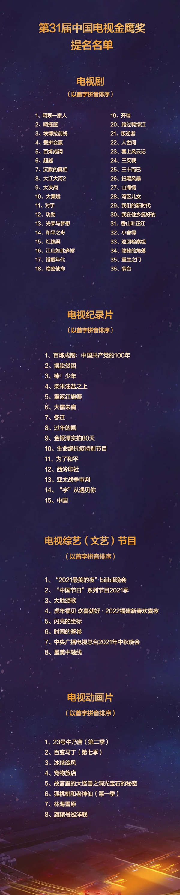 本届金鹰奖继续秉持大众性与专业性相结合的评奖特色,委托中国文联网络文艺传播中心承担作品展播、网络投票工作,采取由观众、中国视协会员、专家评委三方共同参与的评选方式。中国视协会员和电视观众分别在7月13日至8月12日,9月6日至9月15日两个阶段通过网络平台进行投票的初评、终评评审意见,综合汇总以上各方评选结果,并报上级有关部门审批同意,最终产生了包括36部电视剧、15部电视纪录片、8部电视综艺(文艺)节目、8部电视动画片在内的提名名单。