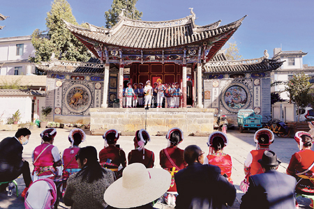 大理市花上花科普宣传艺术团是大理州最具代表性的新文艺群体之一,成员身份都是农民,其中国家级传承人1人、省级传承人1人、州级传承人1人、市级传承人3人。在一片欢声笑语中,大理白族霸王鞭、大本曲等非遗表演让学员切身感受到新文艺群体在民族文化传承和弘扬中的积极作用。