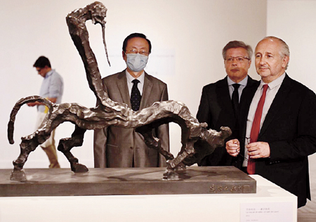 乌拉圭教育和文化部部长巴勃罗·达·西尔韦拉(右)、乌拉圭国家视觉艺术博物馆馆长恩里克·阿盖尔(中)、中国驻乌拉圭大使王刚(左)欣赏吴为山雕塑《空谷有音——老子出关》