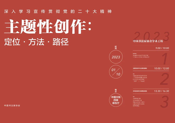 为学习宣传贯彻党的二十大精神,总结年度主题创作和学术研究成果,推动书法事业繁荣发展,1月10日,中国书协“主题性创作:定位·方法·路径”学术工坊在北京中国文艺家之家举办。学术工坊以主题发言、交流互动、学术评议的方式,对“主题性创作与主题性展览”“书写的规范与笔墨的表现”两大核心话题的九个议题,展开讨论。
