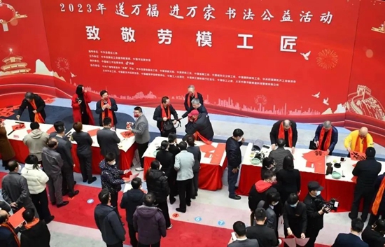1月9日,由全国总工会指导,全国总工会宣传教育部、中国书协主办的2023年“送万福、进万家”书法公益活动在中国职工之家举办首场活动——“致敬劳模工匠”专场。活动现场,书家们挥毫泼墨,为劳模工匠代表以及医务工作者、社区工作者、新就业形态劳动者等一线职工书写春联和“福”字,表达新年的问候与祝福。