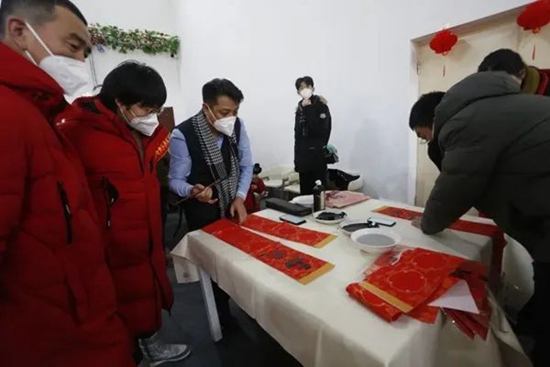 1月16日,黑龙江省文联组织文艺志愿者到松花江畔,开展“我们的中国梦——文化进万家”省文联文艺志愿服务走进太阳岛雪博会活动。活动现场,艺术家们挥毫泼墨,一副副寓意吉祥美好的春联和大红“福”字送上了艺术家们真挚的节日祝福,喜庆题材的国画和剪纸作品更是为春节的到来营造了浓浓的节日氛围。