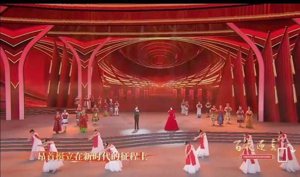 最后,在文化科技融合的创意设计和以各全国文艺家协会为基本单元的叙事中,充分彰显了文联组织的优势和特色。从节目呈现看,各艺术门类节目显然是经过深思熟虑而精心挑选的。每一个门类艺术家的创意拜年后,紧接着往往是极具相应艺术门类特色的节目上演。比如,中国剧协嘉宾集体拜年后,就是涵盖戏歌、京剧、豫剧、黄梅戏等不同剧种的《戏曲联唱》,观众耳熟能详的选段,韵味十足地展现了传统戏曲的魅力与风采。再如,歌曲《中华全家福》既体现摄影专业特点,又营造了新春团圆拍全家福的习俗氛围;创意舞蹈《年画舞》融合文化科技手段,将美术、民俗、舞蹈等专业特色结合起来,不仅体现了艺术源于生活的真谛,也很好地展现了中华民族大家庭中各地劳作、丰收的场景和不同的年俗风情;即便像书法、评论这样舞台展示性较弱的艺术门类,也通过送福字、点评导赏的方式,让我们看到文艺百花园中的缤纷多彩。在歌曲《千千万万个你和我》《我的祖国》、朗诵《向人民,再出发》中,文联的组织优势、专业优势搭建起艺术与生活、艺术与人民的紧密联系,一个个个体凝聚成奋进新时代、追求美好生活的中华民族大家庭,并在歌曲《领航》中达到了高潮,也再次呼应了高铁行进的意象。