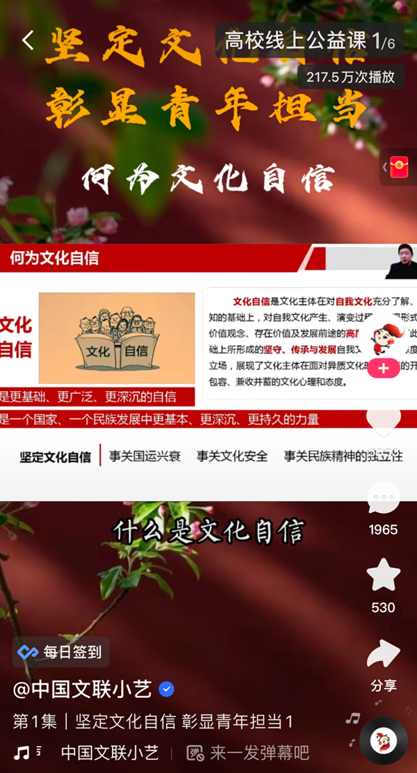 日前,由中国文艺网、中国青年网共同主办的“坚定文化自信,彰显青年担当”2022年高校线上公益课活动在中国文艺网官方快手账号“中国文联小艺”上成功举行。