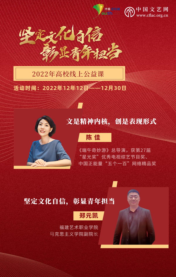 此次线上公益课程,旨在深入学习贯彻落实党的二十大精神,传承中华优秀传统文化,助力提升国家文化软实力和中华文化影响力,增强实现中华民族伟大复兴的精神力量,让网络文艺助推高校青年文化自信自强。课程涵盖“坚定文化自信,彰显青年担当”与“传统文化的当代表达”两个主题,邀请福建艺术职业学院马克思主义学院副院长郑元凯、河南卫视2021中国节日系列节目《端午奇妙游》总导演陈佳分别为学生授课。