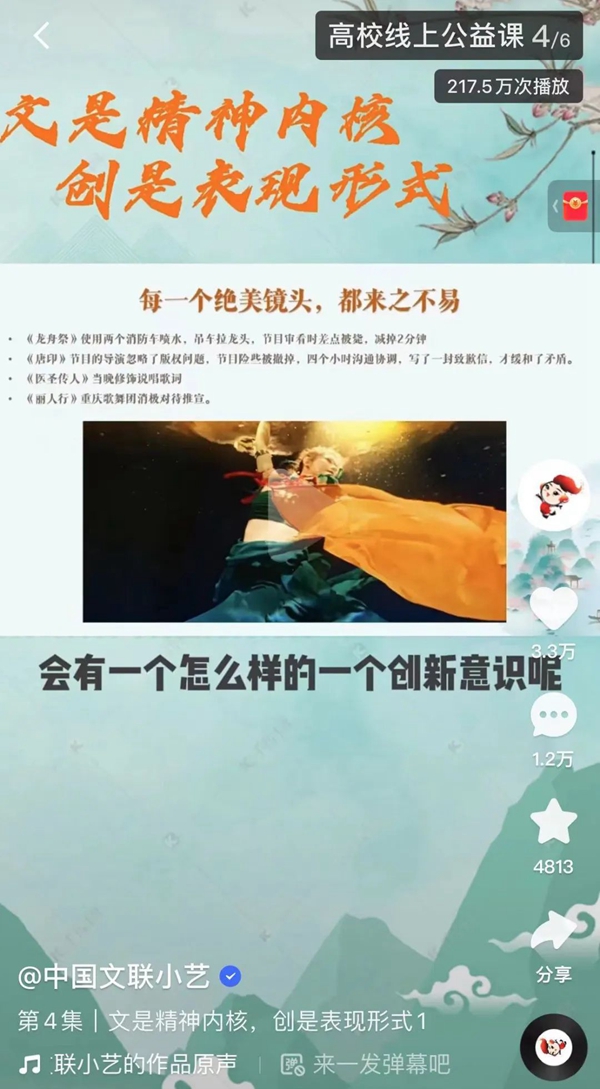 “坚定文化自信,彰显青年担当”2022年高校线上公益课活动是中国文艺网在快手平台开展的短视频培训课程,既是对探索“互联网+文艺”新型服务形式的积极尝试,也是在疫情防控要求下开展工作的主动作为。这次培训通过主流短视频平台开展,通过互联网传播中华优秀传统文化的同时,也建立起全国知名专家学者与大学生之间的桥梁,在提升高校学生文化自信与艺术素养的同时,为高校第二课堂在新时代的创新提供实践经验。