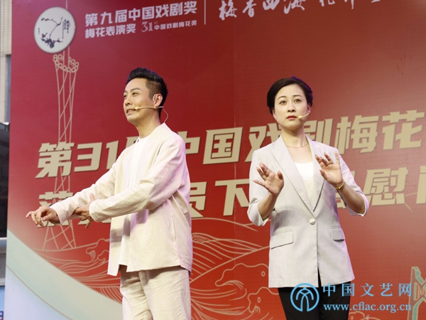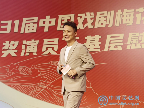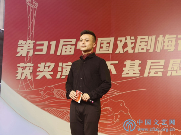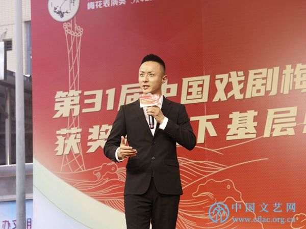 郝士超为大家带来自己的拿手好戏《林冲夜奔》选段,引得现场叫好声不断。他表示将苦练多年的技艺奉献给观众是梅花奖的精神所在,也希望今后抓住每一次的基层演出机会,让自己家乡的剧种能更加走近大众生活。