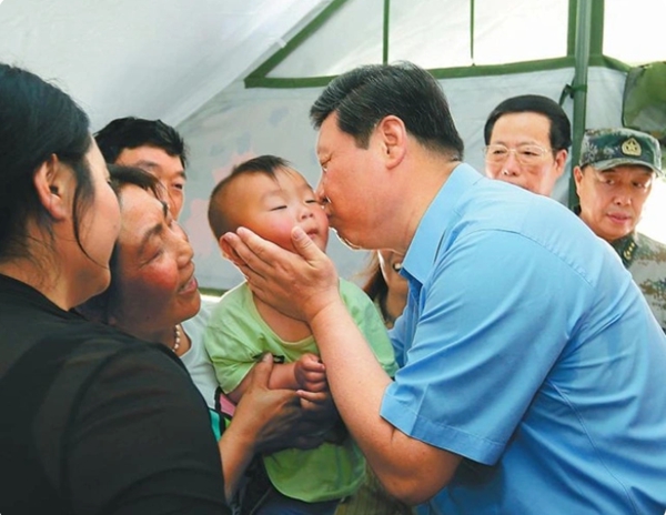 2013年5月21日至23日,中共中央总书记、国家主席、中央军委主席习近平到四川芦山地震灾区考察,看望慰问受灾群众。这是5月21日,习近平在芦山县体育馆安置点一帐篷内亲抚一小孩。新华社记者 兰红光 摄