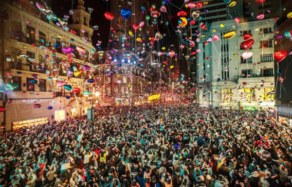 2021年12月31日,伴随着跨年的钟声,湖北省武汉市江汉路中心广场上的人们放飞手中的气球,迎接新年。陈卓 摄 (“筑梦——我们的新时代摄影作品展”参展作品)