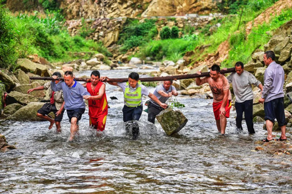 2019年6月30日,位于桂黔交界大苗山腹地的乌英苗寨,驻村干部带领村民维修河堤。当地干部群众齐心协力,艰苦奋斗,乌英苗寨于2020年实现整体脱贫摘帽。黄孝邦 摄 (“筑梦——我们的新时代摄影作品展”参展作品)