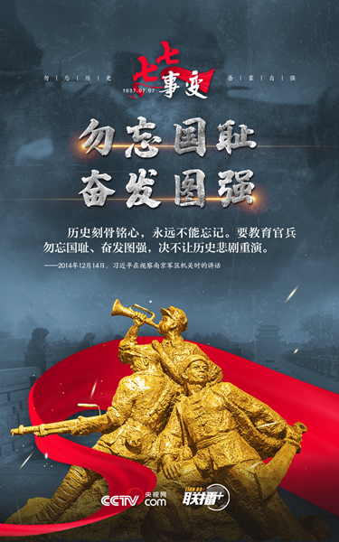 悼念同胞,缅怀先烈。勿忘历史,吾辈自强!在“七七事变”86周年之际,央视网《联播+》栏目特推出海报,与您一起从总书记讲话中汲取自强不息的奋进力量。