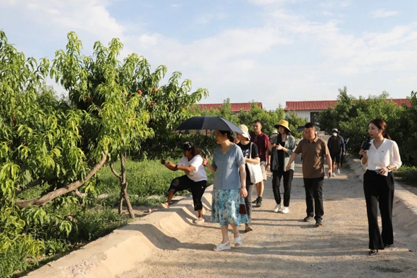 新疆不仅盛产最甜的葡萄,也出产最优质的棉花和蟠桃。烈日炎炎之下,采风团一行还前往位于143团辖区的棉花地、蟠桃园走访调研。棉田远远望去是一望无际的绿色,一直延伸到后面的将军山。走近观察,棉秆已长到小腿肚高,都已结出花蕾并绽放。当地流传着这样一句话:中国棉花看新疆,新疆棉花看兵团,兵团棉花看八师。随后,采风团又来到蟠桃园。园子里,一株株桃树整齐排列,或红或绿的蟠桃挂满枝头;园门口,桃农们正忙着给刚刚采摘下来的桃子称重、装箱、发货。大家与桃农热情交流今年桃园生产销售情况。一路走访调研中,真切感受团结和谐、繁荣富裕、文明进步、安居乐业、生态良好的美好新疆,文艺助力乡村振兴,电商直播已经是石河子物产销售的主要渠道。