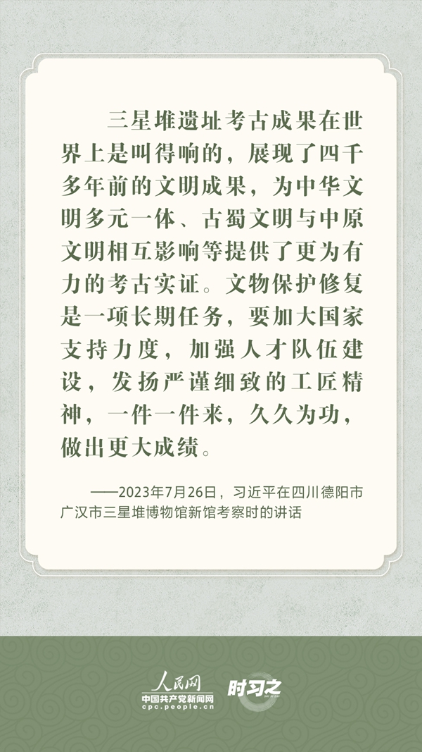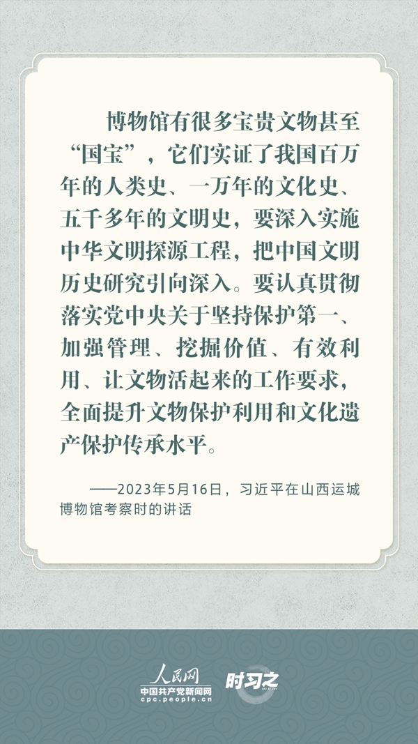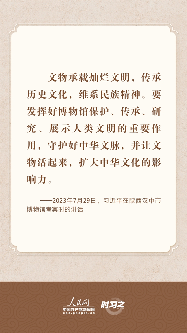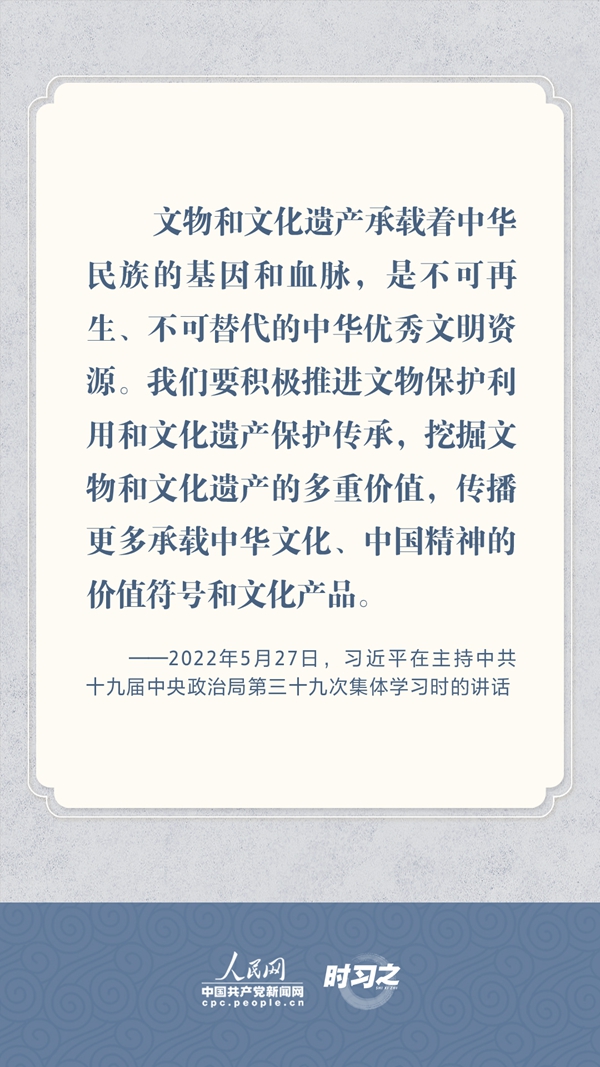 文物承载灿烂文明,传承历史文化,维系民族精神。习近平总书记站在中华民族和中华文明永续传承的战略高度,不断强调保护传承中华优秀传统文化,为增强文化自信、激发中华优秀传统文化的生机与活力注入了强大精神动力。