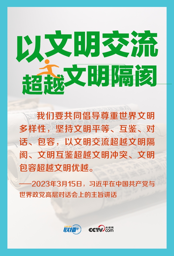 联播+ 文明因交流而多彩,文明因互鉴而丰富。今年3月,在中国共产党与世界政党高层对话会上,习近平主席首次提出全球文明倡议,主张“共同倡导尊重世界文明多样性”,为推动文明交流互鉴、促进人类文明进步提供中国方案。