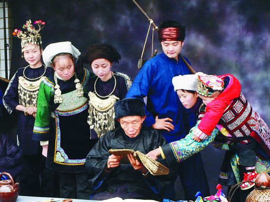 文化大发展大繁荣离不开民间文化。被列入第一批国家级非物质文化遗产名录的水书是水族先民创制的别具一格的象形文字,也指用这种象形文字撰写而成的大量典籍,通过手抄配合口传心授的大量内容。水书在水族人民的丧葬、祭祀、营建、婚嫁、出行、节令、占卜、农事等活动中发挥着一种指令规范作用,历经数千年的传承发展至今,形成了固有的文字体系和地域文化特征,被誉为水族的百科全书。图为贵州水族居民在看水书。
