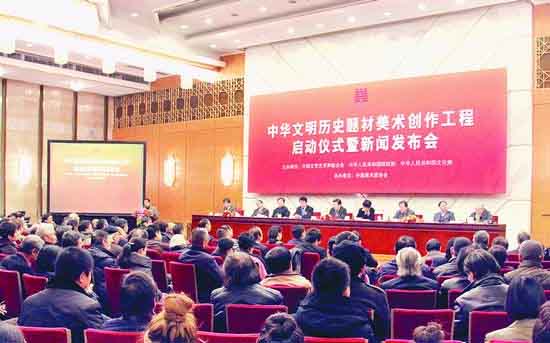 12月17日,经中宣部批准,由中国文联、财政部、文化部主办,中国美协承办的中华文明历史题材美术创作工程在北京人民大会堂启动。全国政协副主席、中国文联主席孙家正以及中国文联党组书记、副主席赵实,中国文联党组副书记、副主席覃志刚,中国文联党组成员、副主席冯远,中国国家博物馆馆长吕章申,中国文联党组成员、书记处书记夏潮,中国作协党组成员、书记处书记白庚胜,中国美协分党组书记、驻会副主席吴长江与主承办单位代表、全国各地著名美术家代表出席启动仪式。中国美协秘书长刘健主持启动仪式。