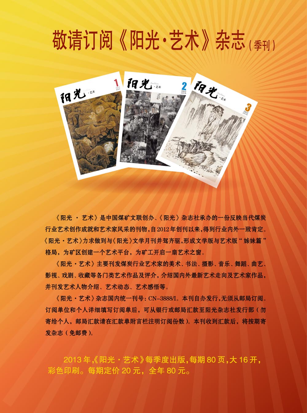 2013年《阳光》文学、艺术征订单 来源:中国煤矿文化网 作者:阳光杂志社 时间:2012-10-09 【字体:小 大】 附: 2013年度《阳光》艺术季刊征订专用收据 2013年度《阳光》文学月刊征订专用收据 分享到: 【打印正文】