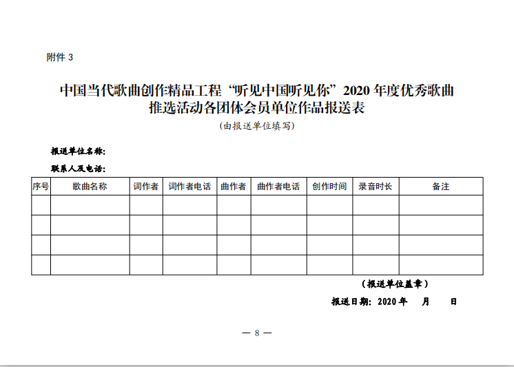 中国音协现启动“听见中国听见你”2020年度优秀歌曲征集活动。煤矿文联音乐分会将在煤炭系统内部进行征集并统一报送。请相关单位仔细阅读文件,做好报送工作。