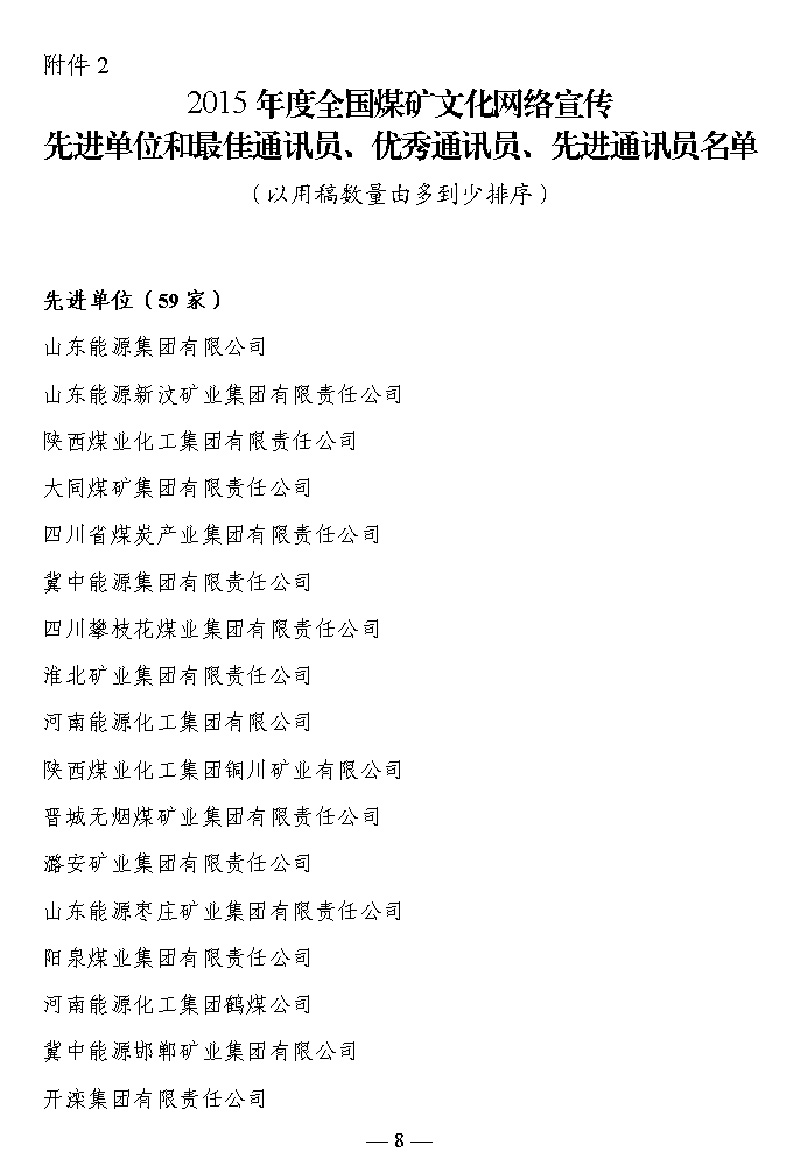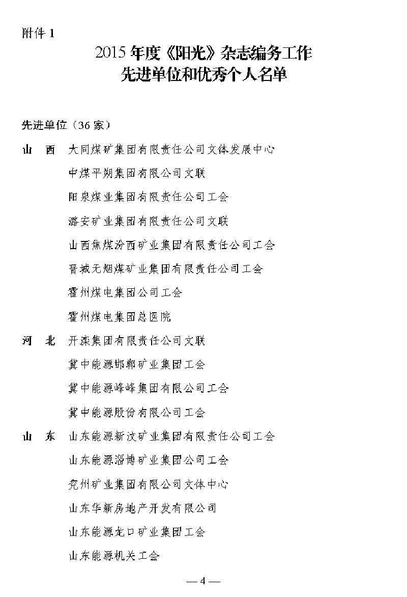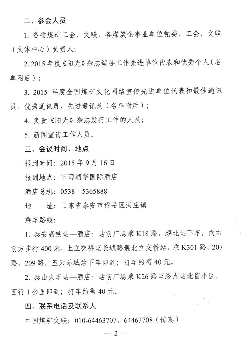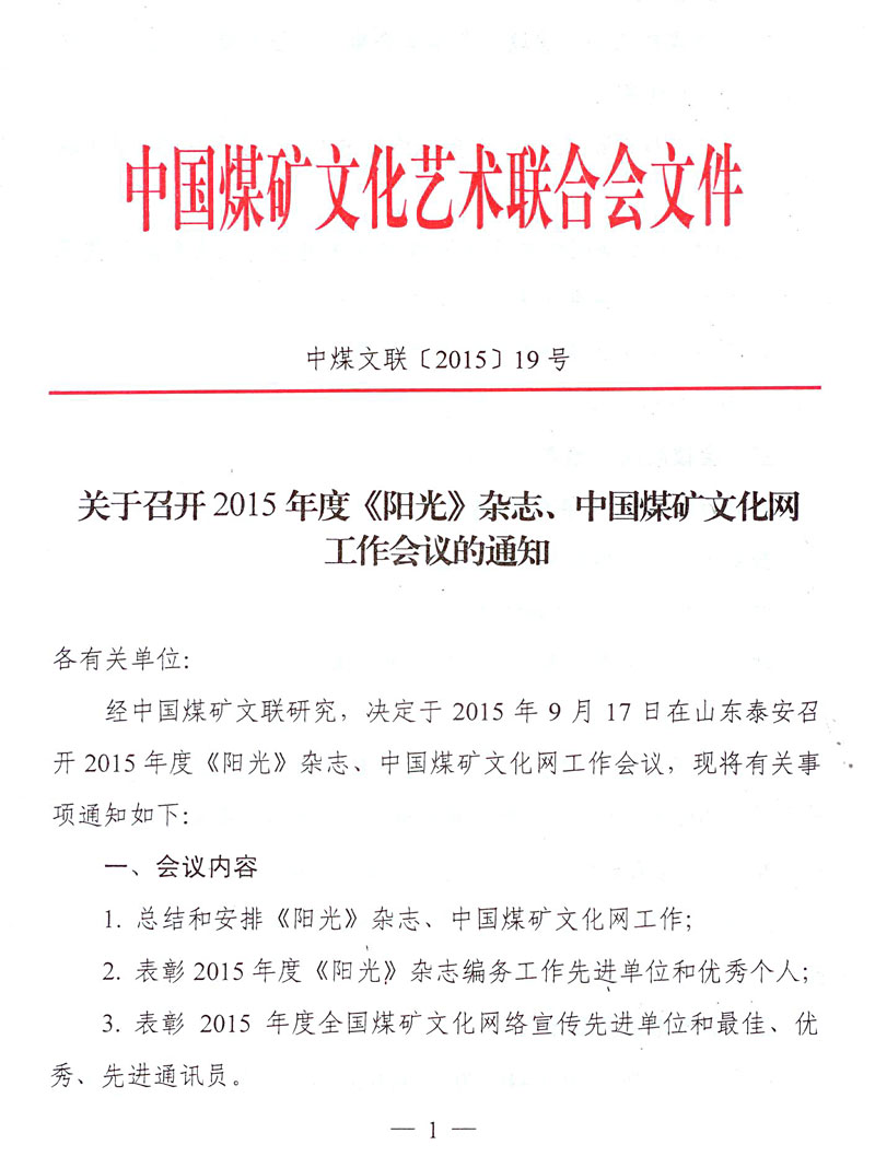 关于召开2015年度《阳光》杂志、中国煤矿文化网工作会议的通知 来源: 作者: 时间:2015-08-21 【字体:小 大】 附件: 1. 2015年度《阳光》杂志编务工作先进单位和优秀个人 名单 2. 2015年度全国煤矿文化网络宣传先进单位和最佳通 讯员、优秀通讯员、先进通讯员名单 3. 参加会议人员回执 智能标签: 阳光 煤矿文化网 相关内容 分享到: 【打印正文】